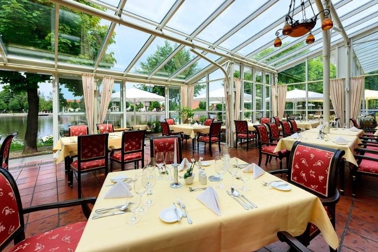 Frühstück gibt es von 6:30 bis 10:30 Uhr, Abendessen von 18:00 bis 21:00 Uhr. Bei schönem Wetter lockt die Seeterrasse mit Blick aufs Wasser.
